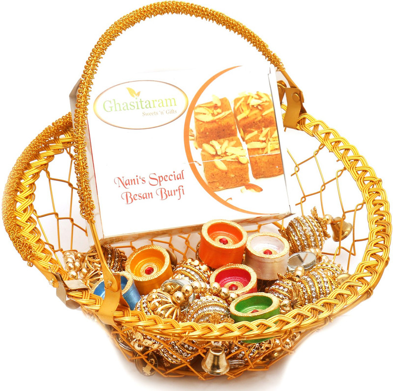 Ghasitaram Gifts Hampers-Golden Metal Basket Basket with Nan ...