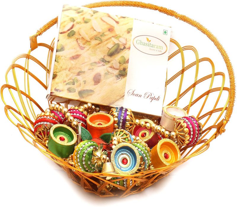 Ghasitaram Gifts Hampers-Gold Wired Basket with Soan Papdi, ...