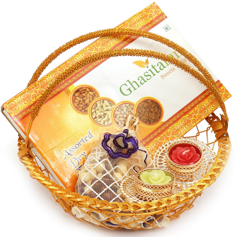 Ghasitaram Gifts Golden Basket with Dryfruit Box, Nutties Po ...