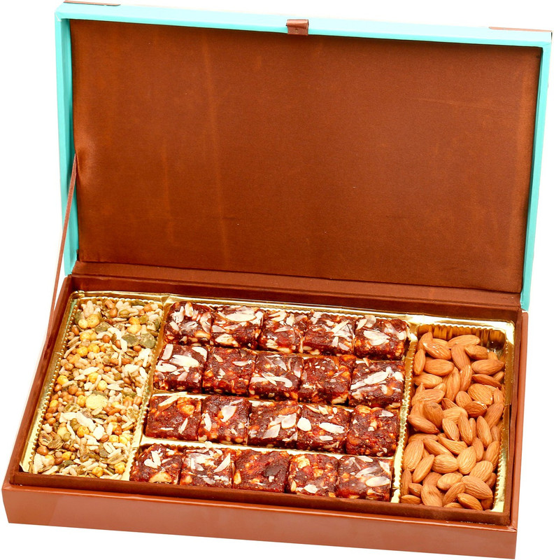 Ghasitaram Gifts Wooden copper Platter with Soan papdi , alm ...