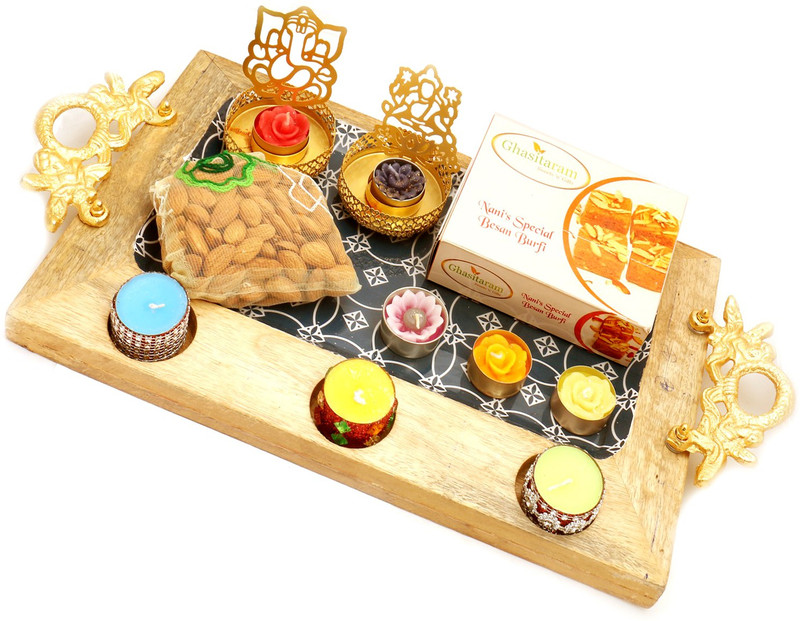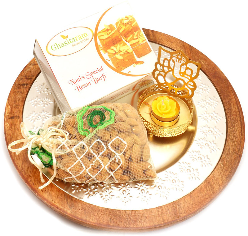 Ghasitaram Gifts Silver wooden Platter with Besan Barfi , al ...