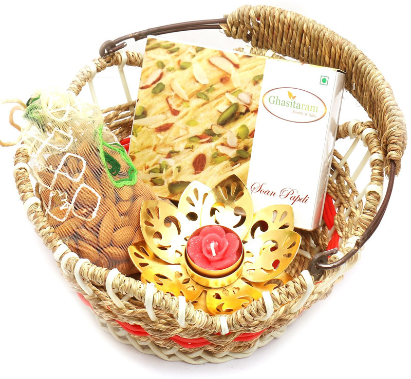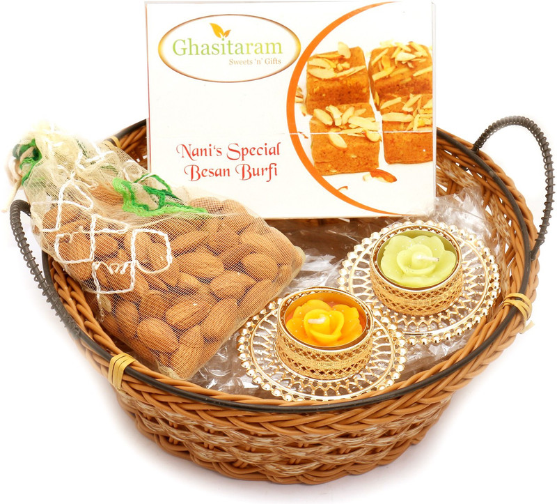 Ghasitaram Gifts Jute Cane Basket with Soan Papdi, Almonds P ...
