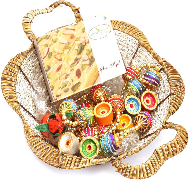 Ghasitaram Gifts Brown Basket Basket with Soan Papdi, Toran ...