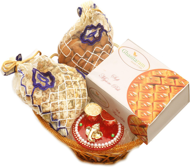 Ghasitaram Gifts Small Cane Basket with Mysore Pak and Almon ...