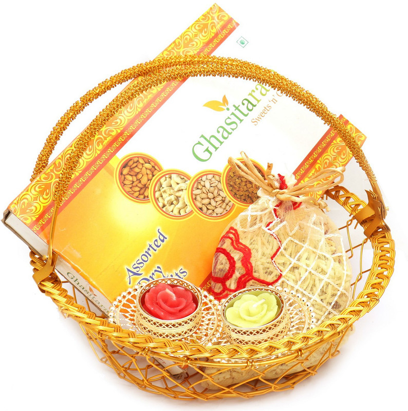 Ghasitaram Gifts Hampers-Golden Metal Basket with Dryfruit B ...