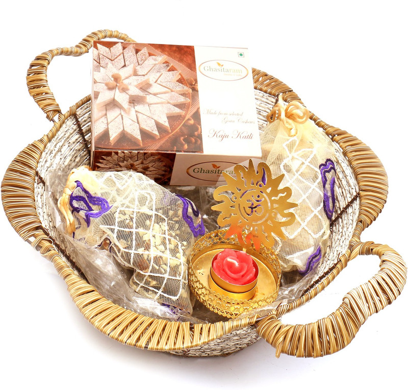 Ghasitaram Gifts Hampers-Brown Basket with Kaju Katli, Engli ...