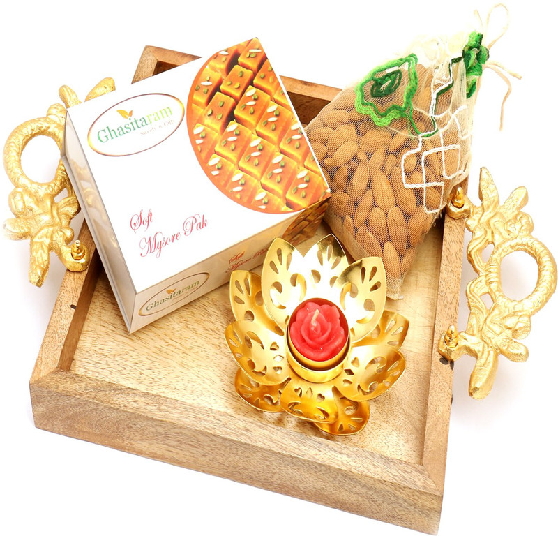 Ghasitaram Gifts Square wooden Platter with Mysore Pak , alm ...