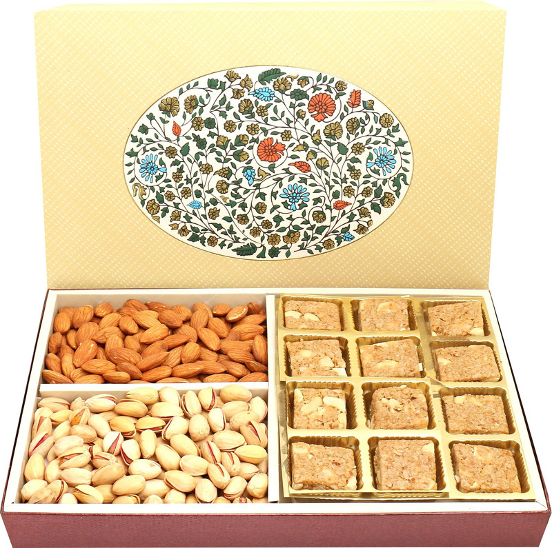Ghasitaram Gifts Hampers-Brown Basket with Kaju Katli, Almon ...