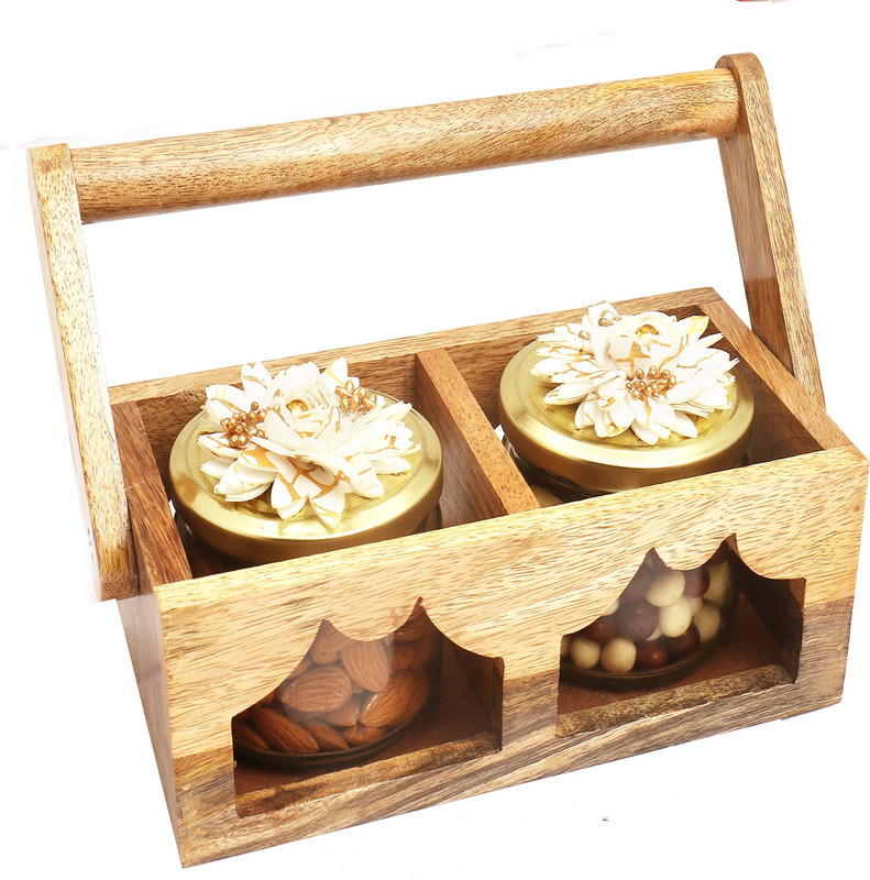 Ghasitaram Gifts Wooden Basket with Almonds and Nutties Jars ...