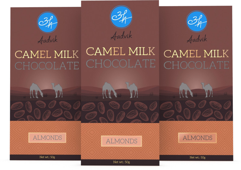 Aadvik Camel Milk Chocolate with Almonds – Pack of 3 x 50g Bars -150g. Camel Milk Chocolates by Aadvik represent the discerning taste of the desert world. These Camel Milk Chocolates represent the refined elegance and are made from low-fat camel milk and rich cocoa. Camel milk is rich in vitamin C, Iron and long chain fatty acids, enhances the chocolate texture making it healthier and smoother than other Chocolates. These exquisite flavored chocolates by Aadvik will leave you mesmerized. Key Ingredients Butterscotch, Cocoa Solids, Camel Milk Powder.