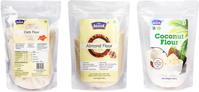 Almond flour is a gluten-free nut flour made from grounding blanched almonds. Its often used as a healthier substitute for refined wheat flour in bread and other baked goods. Add to your Pancakes, Muffins, Cakes & Cookies, Puddings, Kheer, Sweets, Badam-katli, grain-free baking mixes. Coconut flour is a unique low carb & gluten-free alternative to wheat flour. Coconut flour is made from coconut flesh that has been dried and ground after the extraction of virgin coconut oil. It offers several benefits like blood sugar stability, better digestion, heart health, and eventually weight loss. It can be substituted for refined wheat flour for making baked goods. Anirink oats flour is made from stone-ground rolled oats. It is rich in fiber & good for digestion. It can be used for making baked goodies, dosas, uttapam, etc. It can be substituted for all-purpose flour for making bread, cakes & other baked goods.