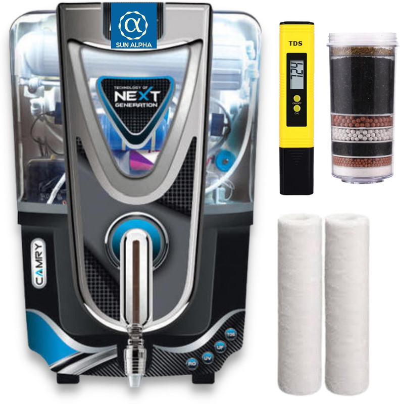 Free TDS meter,1+1 Free spun candle, 1 year warranty on Electrical parts only. Water purification stages 1st stage- Water enters pre-filter, a spun candle which stops dirt and heavy metals. 2nd stage- Thereafter, Activated carbon filter to remove smell and removes bulk particles. This enhances RO membrane life. 3rd Stage- RO membrane of 0.0001 micron, it blocks everything and purest water comes out. 100GPD pump helps giving pressure to pass out from the membrane. 4th Stage- Mineral cartridge adds minerals like calcium, magnesium, potassium, sodium, zinc, iron and more. 5th stage- UF membrane to cleanup in a separate chamber. 6th Stage- TDS Controller to adjust TDS if lowers down too less. 7th Stage- Deactivate germs such as bacteria/viruses. RO+ Membrane enhancer+ BIO+ Alkaline+ UF+ TDS+ UV+ minerals