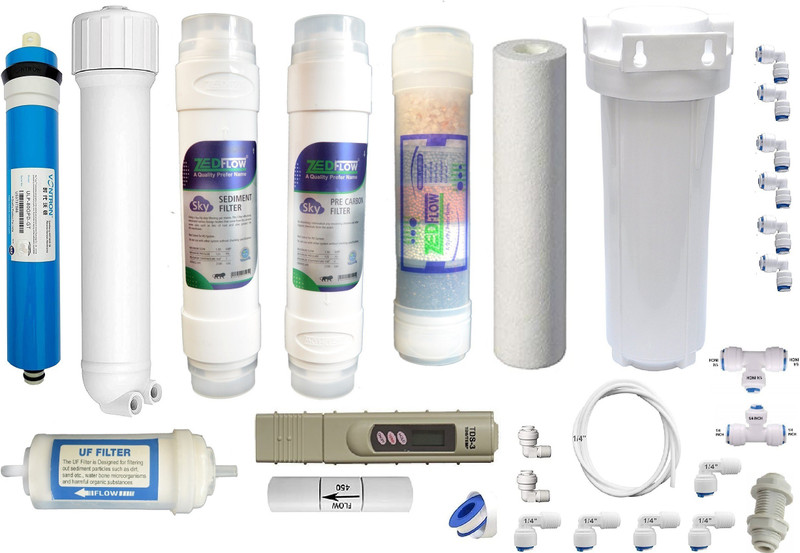 1 Carbon Filter, 1 Sediment Filter, 1 Membrane, 1 Housing, 1 TDS, 1 Mineral Cartridge, 1 UF, 16 Fittings, 2 Mtr pipe, 1 Teflon Tap, 1 FR, 1 Spun Filter, 1 Pre Housing