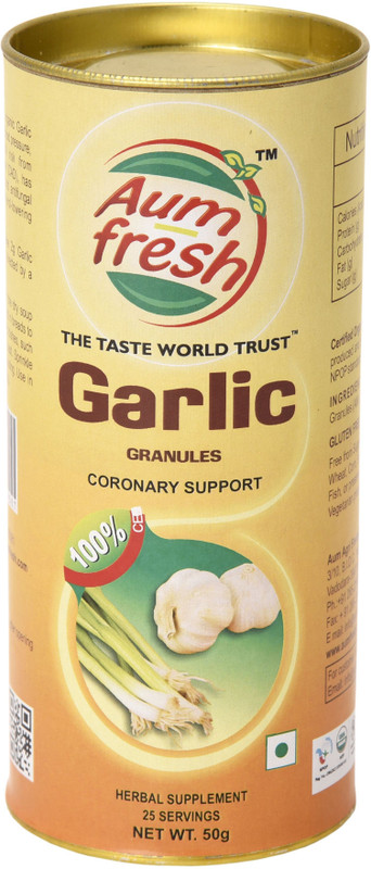 Aumfresh Garlic Granules – 100% Pure & Natural, 50 gm No artificial flavour & No preservatives Can is processed with unique Advanced Low Temperature Cold Dried (LTCD) technology and are marketed in Cubes, Flakes, Strips, Granules and Powder form -when compared with sun dried or freeze dried , our products are found to yield all the qualities like color, flavor, aroma, taste, rehydration, nutritional values and increased shelf life property to an unmatchable extent taking it very close to the fresh ones and makes our technology the best drying technology of the present era. Aumfresh is committed to supply quality products. It is scientifically proved that efficacy of a product is influenced by the processing environment. Aumfresh cultivates, harvests and processes its products under strict surveillance and holistic conditions. We work with thousands of small family farmers in India to cultivate thousands of acres of sustainable organic farm land. By choosing Aumfresh products you are not only getting pure solid matter but also spiritual vibrations imbibed nanoscopically during processing. Aumfresh proves itself to be your right choice.