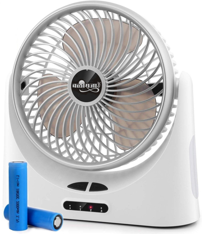 Portable LED Rechargeable Fan for Home, kids, kitchen, Picnic, Outdoor etc… Strong Airflow, Quiet Operation, Long working hours, 4000 mAh Li-ion batteries, 120-degree rotation, Power Bank Function, LED Night Light (To ON long press ON button for 3 second)… <>- This 7-inch cooling rechargeable fan will definitely stand out among those desk fans. Brushless motor reduces the noise so that the fan works quietly even on a high speed. Perfect Portable fan for home and office use. <> With high-quality motor, the maximum fan speed can reaches to 2100 rpm for only having 3 fan blades. Great for air circulation and ventilation. <> With high-quality motor, 3 speeds, it circulates a lot of air for only having 3 Fan Blades. It not only offers cool wind, but also helps air circulation and ventilation. <> This battery USB fan can be powered by two replaceable and rechargeable 2000mAh (Total 4000mAh) 18650 batteries ( INCLUDED ). The batteries can last 5~17 hours depending on different speeds. Also, this fan can be powered by USB Cable(Included). When using the Micro USB input, this fan can be powered by PC / Notebook, power bank, car charger, phone charger, 5V DC wall charger, etc. What’s more, the desk fan itself can be used as a power bank to charge your cellphone. ?120 Degree Rotation? This white desk fan swivel up and down to 120 degrees. Enjoy the cool wind from different directions… <> : It has 3 settings, so you can choose one according to your preference and the fan can swing up and down, the strong airflow can cool you down in several minutes… {Speed 1: 12 hours} {Speed 2: 6 hours} {Speed 3: 4 hours} Also, it can be powered by USB interface… Rechargeable fan for baby, fan for kids, Charging fan, Rechargeable fan with LED Light, Rechargeable fan 7 inch.