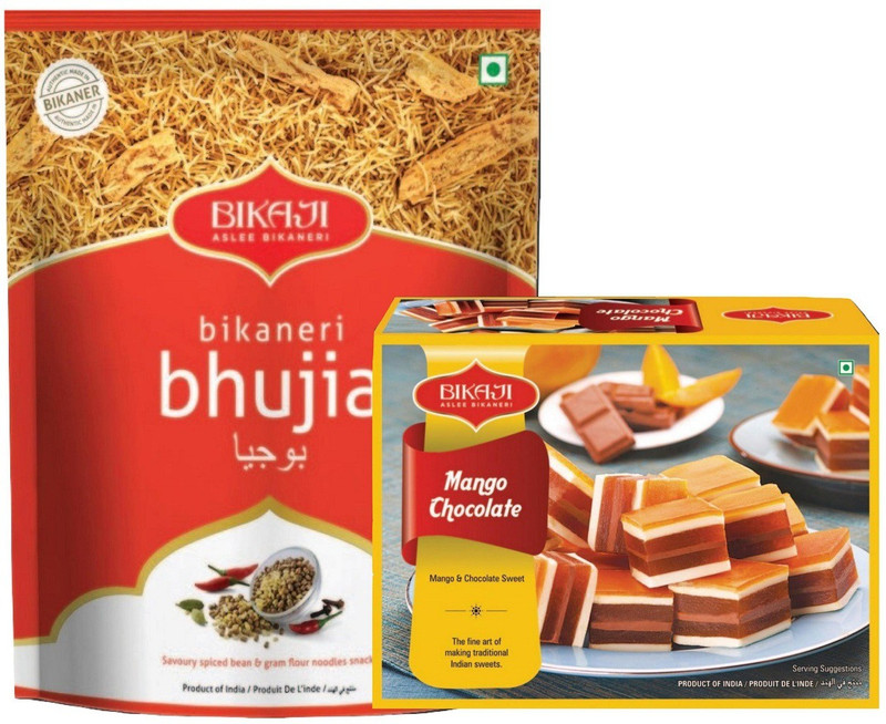Enjoy the delicious combo of Bikaji Bikaneri Bhujia and Bikaji Mango Chocolate for your Family and Friends. Everytime you chew you will experience different flavours from the Sev, the Peanuts and the Lentils. This Navratna Mix has Zero Cholestrol. Spicy snack, blend of savoury noodles, lentils, peanuts & dried potatoes 100% Vegetarian Product of India This product is made in a facility that processes foods containing Peanuts, Tree Nuts, Soy, Milk, Wheat & Sesame. Storage Instructions: Store in a cool dry place away from direct sunlight. Once opened keep in an airtight container. Try our other Products: Bhujiya, Navratna Mix Sub kuch, Cornflakes Mix, Chowpati Bhelpuri, Kaju Badam Laccha, All in One Kuch Kuch, Soan Papdi, Mango Chocolate Sweet, Papad, Anjeer barfi, Khajoor Barfi, Moong Daal, Shahi Mix.