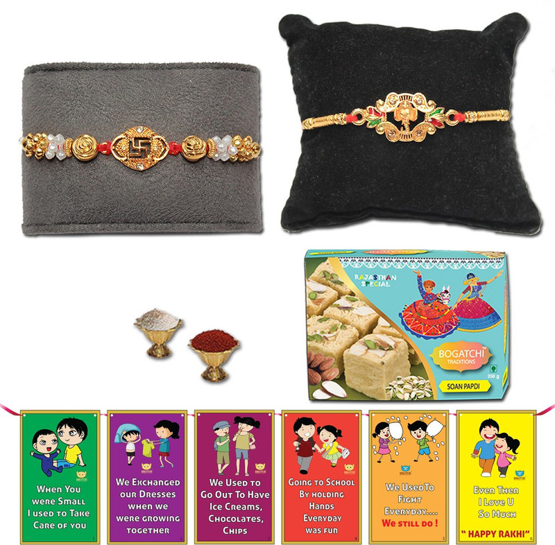 | Package Contents | Soan Papdi box-Rakhi-Roli Chawal-Brother Sister Story Card |