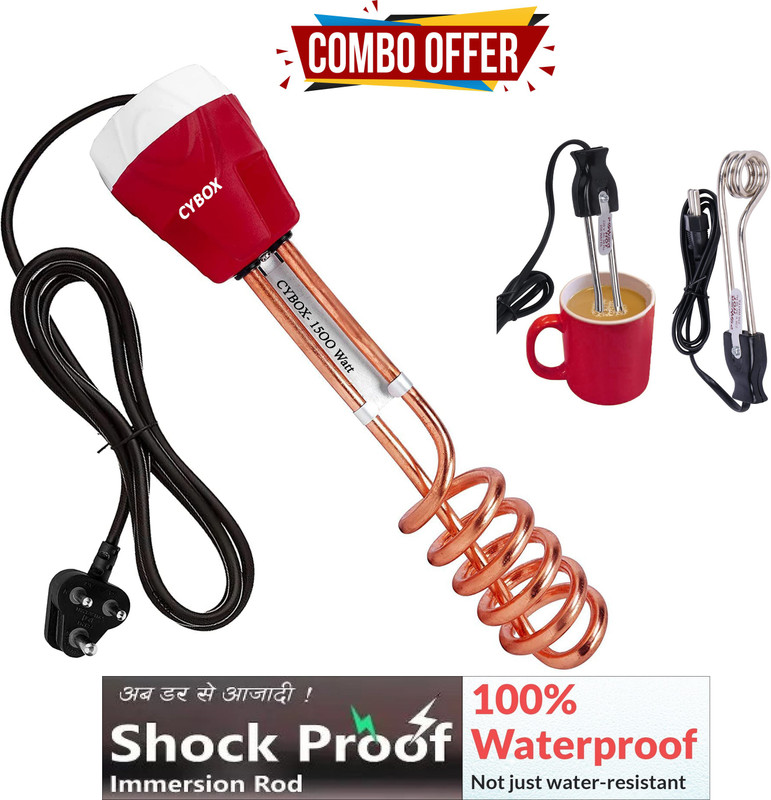 CYBOX IMMERSION ROD WATER HEATER – SHOCKPROOFImmersion water heaters are an extremely useful and convenient ways for heating water. Thanks to its compact size, this immersion heater can be easily accommodated in storing places or cabinets. This Hindustan immersion heater heats the water quickly consuming about 1500W. The main advantage of this Hindustan immersion rod is that advanced shockproof technology is used to manufacture which makes it a very safe option.This immersion water heater is designed with stainless steel elements with copper nickel plating. To get hot water, you have to simply dip it in a tub, bucket, or container of water and switch on the rod.