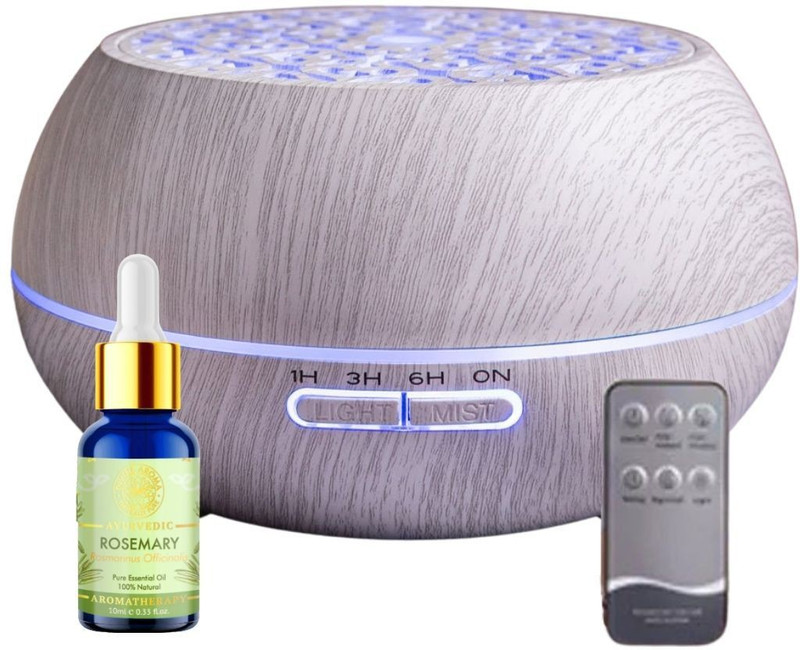 Electronic humidifier based on ultrasonic technology for diffusing essential oils as well as to humidify your room throughout day and night.About: Rosemary is an evergreen shrub which is frequently used for aromatherapy owning to its energising and herbaceous scent. Studies have shown that diffusion of rosemary oil helps with concentration and improves memory retention by upto 5-7%. It is also helpful as a respiratory support oil.Features:Electronic humidifier based on ultrasonic technology for diffusing essential oils as well as to humidify your room throughout day and night.Auto-Shutoff: Without water, it will turn off automaticallyCapacity: 550ml This aromatherapy essential oil diffuser provides a unique as well as natural means to make the most from essential oils in the office as well as a home for creating a peaceful ambiance. Very useful to create the perfect mood in bedrooms or periodic massage sessionsThe perfect solution to diffuse essential oils at whisper-quiet operationsRun time: Approximately 6 hoursRemote controlled7 LED lightsDirections of Use:Fill the bottom beaker with water up to the level indicatedAdd a few drops of your favorite Divine Aroma essential oil Plug in the diffuser and turn on Use remote to operate with convenience Aroma diffuser warranty: 6 months manufacturing defect warranty