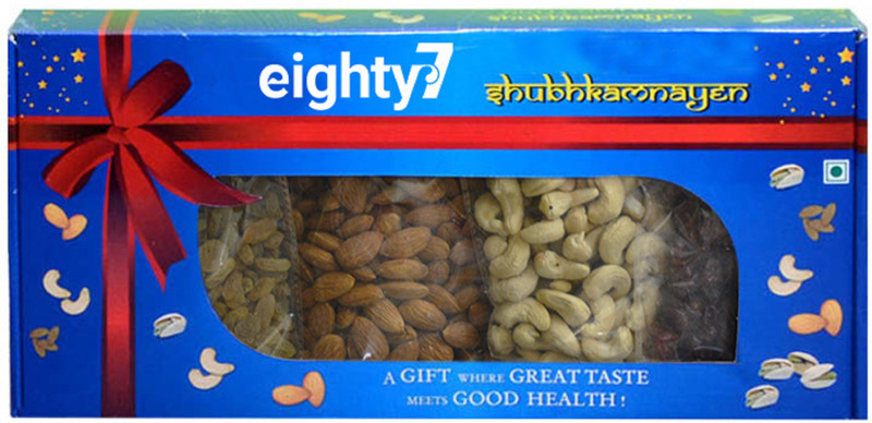 This Pack of Eighty7 Gold Gift Box contains Raw & Natural Californian Almonds 150g, Mangalore Cashewnuts 150g, Green Raisins 150g & Dried Cranberries 150g.Perfect for Gifting, High on Quality and Nutrition