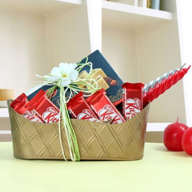 Celebrate the love that you have for your near and dear ones by presenting them with this hamper. This attractive and delectable combo comprises of chocolates, sweets and two candles. Beautifully presented in a golden oval tray, this gift hamper will surely make your loved ones happy. Your Gift Contains: 5 Nestle KitKat Chocolate 12gm Soan Papdi 250gms Golden Tin Oval Tray 9×4 Inches Red Stick Candle 10 Inches Silver Stick Candle 10 InchesFSSAI License number : 13315008000230Customer care mail id : Fnporders@gmail.com