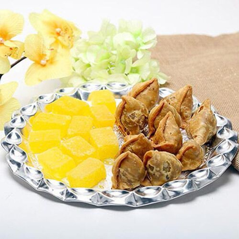 Sweets play an important role in any celebration, especially in Holi. Buy this gift thali to get 250 gms of dry kesar pethas and 250 gms of mini samosas. Play Holi with your loved ones keeping your tummy full with the delicious pethas and samosas. FSSAI License number : 13315008000230Customer care mail id : Fnporders@gmail.com