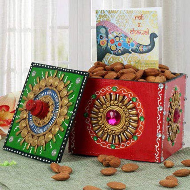 Melt the taste buds of your loved ones with an exotic delight of dry fruits packed beautifully in a red designer wooden box. Attractive in look and classy in feel, this one surely makes a desirable gift item to enliven the Bhai Dooj celebration. Your Gift Contains:Red Designer Wooden Box with Green Lid 5x5x4 InchesAlmonds 200gmsRoli Chawal