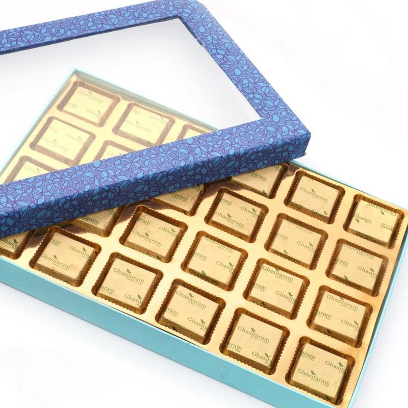 A beautiful box containing crunchy square shaped bites made from Cashewnuts,Almonds,Pistachios, Liquid Glucose, Sugar and Pure Desi Ghee. You have to taste it to believe it.Net Weight: 480 gms, No of pieces: 24..