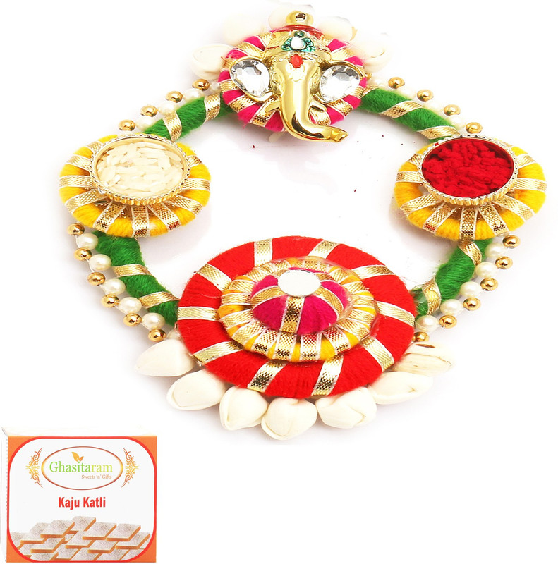Ghasitaram Gifts Colourful Acrylic Pooja Thali with 200 gms of Kaju katli Combo(500g)