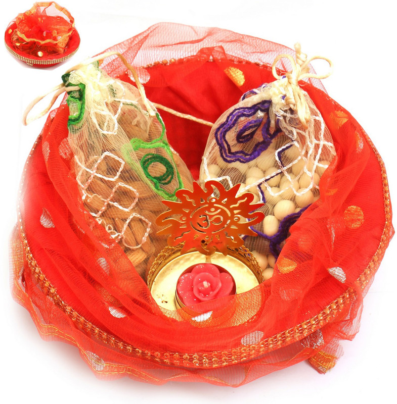 | Model Name | Hampers-Red Potli Basket with almonds, Nutties Pouches and Om t-lite |