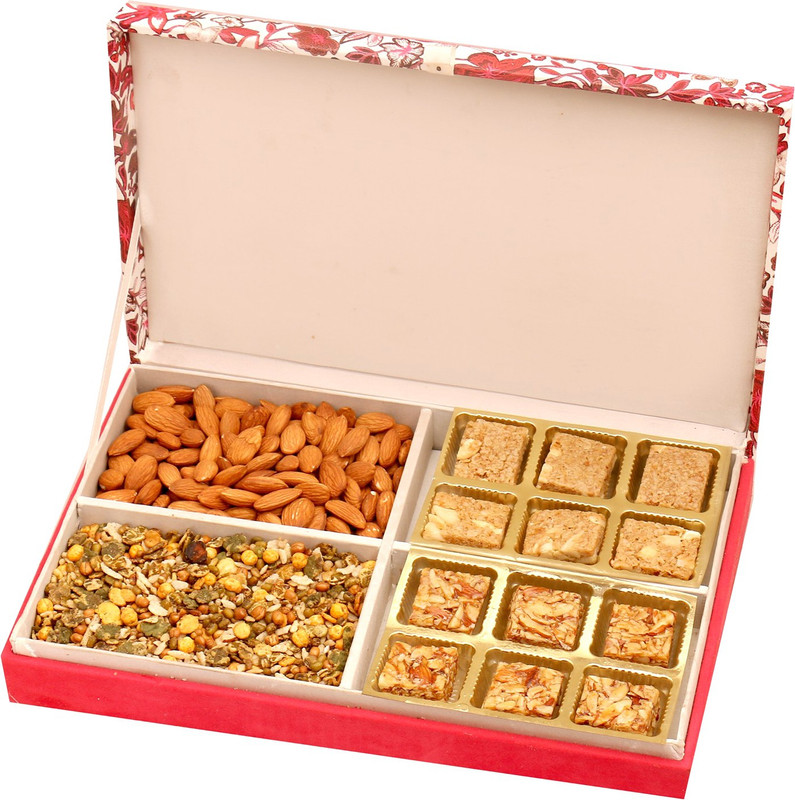 | Model Name | Healthy Hampers-Pink Velvet Wooden Hamper box with Almonds, Sugarfree Dates Figs Bites, Granula Bites and Roasted Namkeen 800 gms |