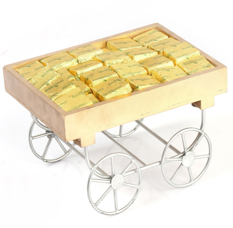 A beauitful Reusable Wooden Cart containing crunchy square shaped bites made from Cashewnuts,Almonds,Pistachios, Liquid Glucose, Sugar and Pure Desi Ghee. Net Weight: 500 gms. This basket can later be used as showpeice or a tray .