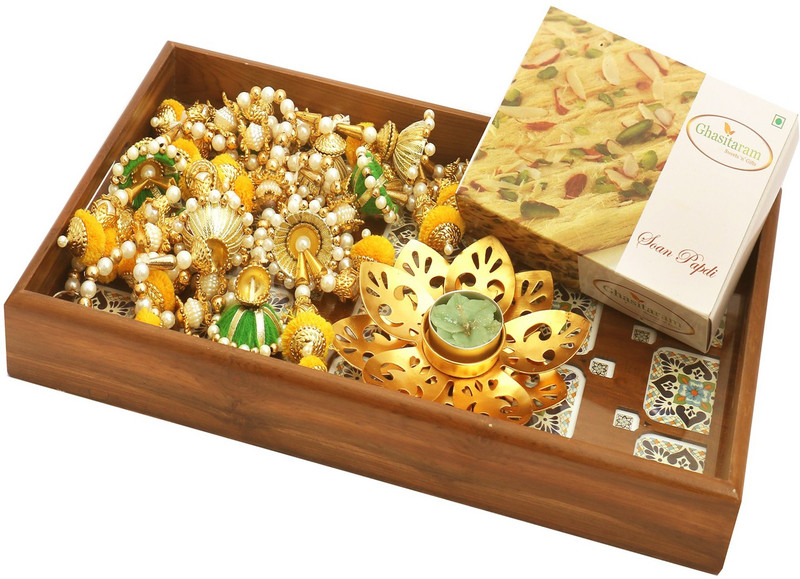 | Package Contents | Soan Papdi, Big Wooden Printed Tray, T-Lite, Toran |