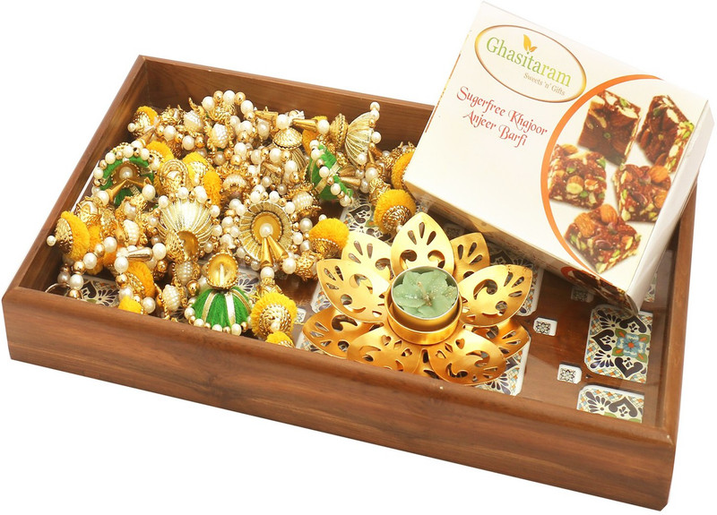 Ghasitaram Gifts Mithai hampers-Big Wooden Printed Tray with Sugarfree Mix,T-Lite, Toran Combo(200g)