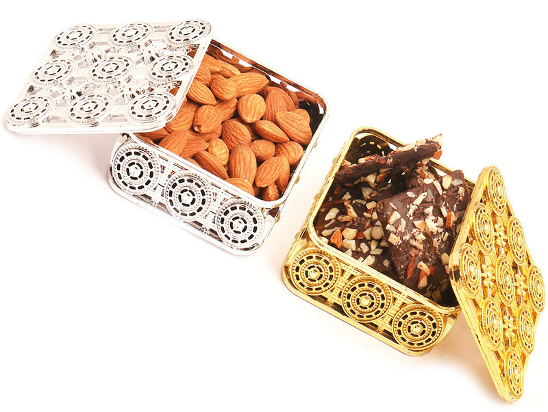 Beautiful Metal Look Plastic Boxes filled with almonds (50 gms) and English Brittle Chocolates (100gms). Net Weight: 150 gms. Dimensions:3″.