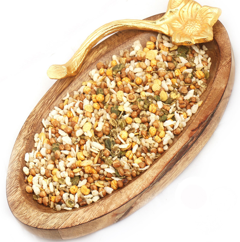 A beautiful Reusable Wooden Platter containing delicious diet protein mix namkeen. Ingredients: Split Bengal Gram, Split Green gram, Green Gram,Chick Peas, Salt and Condiments . Net weight 400 gms. All these Namkeens are vaccum packed and nitrogen flushed to retain their freshness.. The bowl shown is not a part of the product,its only for display.