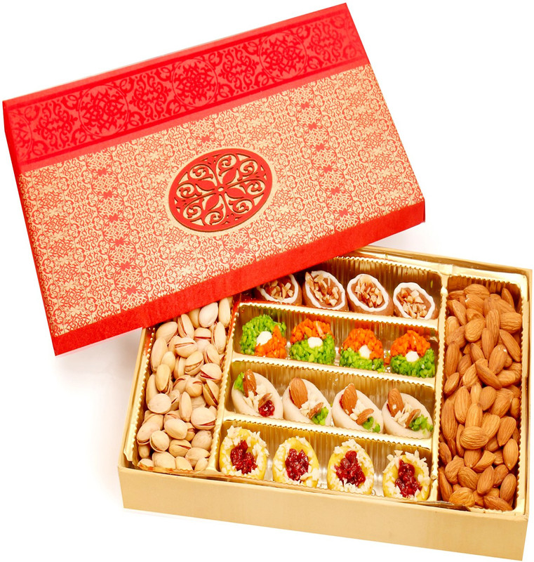 A Beautiful Gift Box Containing Assorted cashew Sweets, best of Almonds and Pistachios. Net Weight: 900 gms.