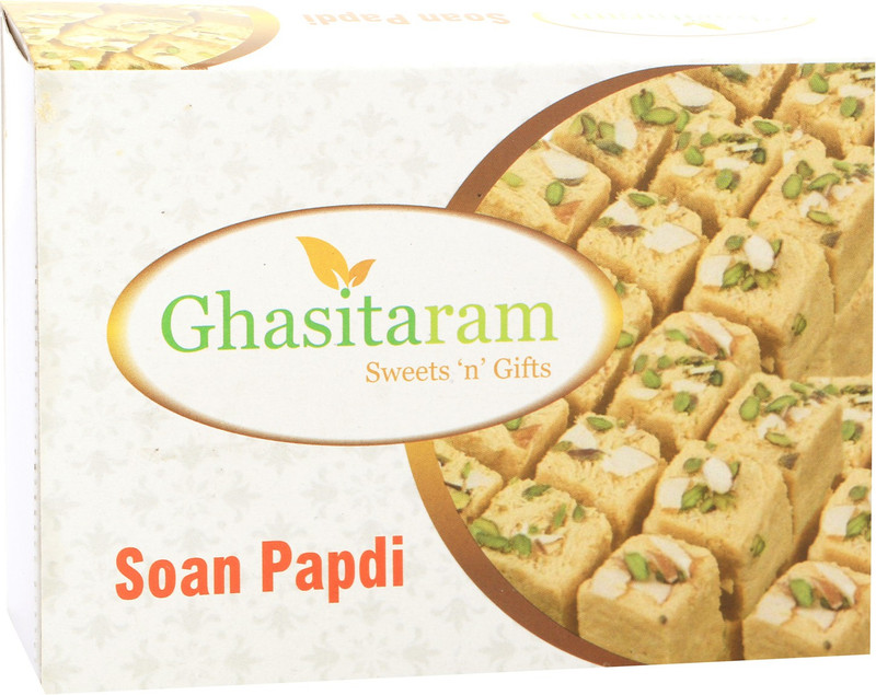All time favourite Soan Papdi made from plain flour, ghee, sugar, water, milk and cardamom seeds crushed coarsely packed in a nice gif box.Net weight 400 gms. This mithai has been specially packed using Italian technology for an extended shelflife..