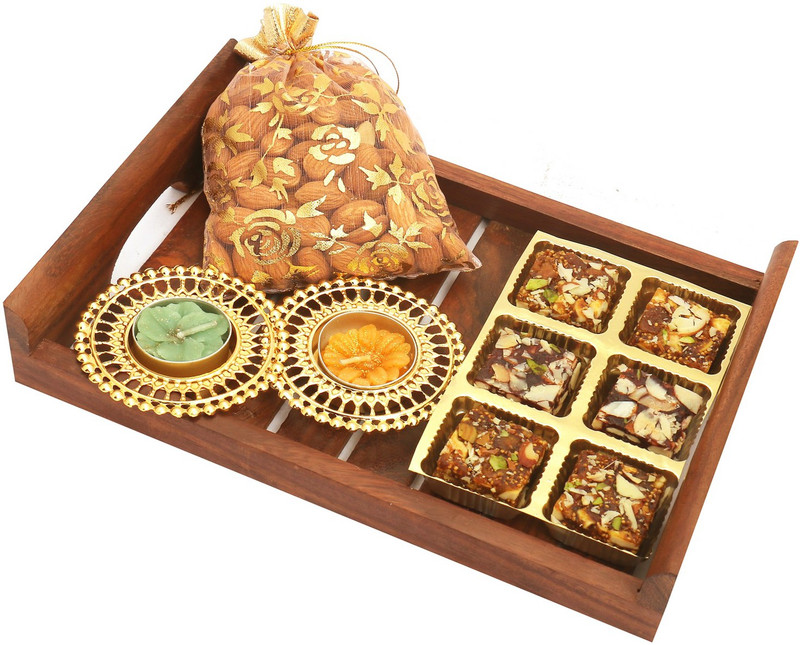 A beautiful Wooden Serving Tray containing Sugarfree Dates and Figs Bites (150g gms), Almonds Pouch (200 gms) and a 2 Metal T-Lites. Net Weight: 350g gms.. Dimensions:10*7″.