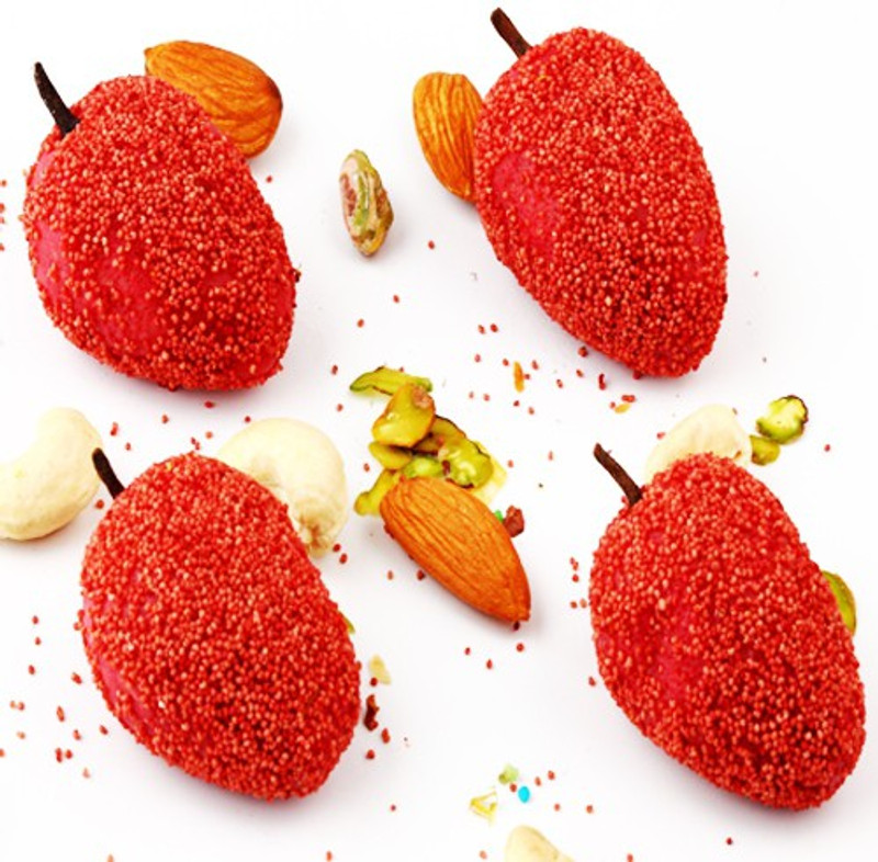 Exotic Dryfruit Sweets made from Best Goanese cashews with the sweetness of natural flavour strawberries with the right amount of sweetness in a gift box. This mithai has been specially packed using Italian technology for an extended shelflife. Net weight: 400 gms.
