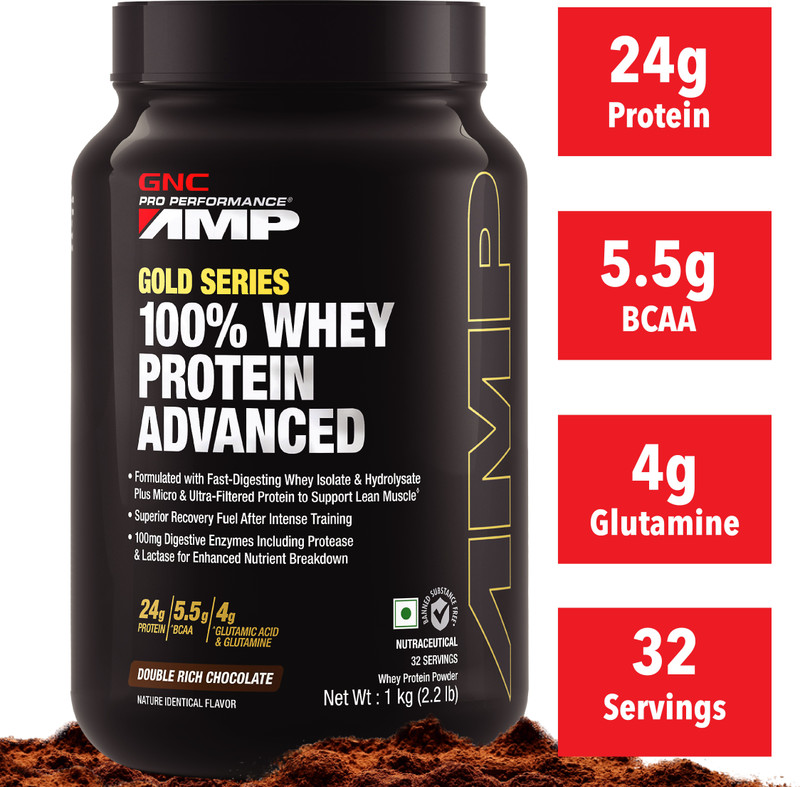 GNC Amp Gold Series 100% Whey Protein Advanced – 2.2 lbs, 1 kg (Double Rich Chocolate). GNC Amp Gold series is formulated with fast digesting Whey Isolate + Whey Concentrate + Whey Hydrolysate.Each serving contains 24g of protein, 5.5g of BCAA and 4g of Glutamic Acid & Glutamine.Hydrolyzed Whey Peptides for superior absorption and nutrient uptake..5.5g Branched Chain Amino Acids for advanced recovery and performance..4g Glutamine and Glutamine leads to maximize muscle recovery with this vital amino acid that is important for hydrating and fueling muscle cells, plus maintaining proper absorptive function in the digestive system.