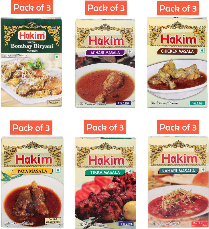 | Other Features | Package Contains : Pack of 3-Chicken Masala 50gm each, Pack of 3-Paya Masala 50gm each, Pack of 3-Tikka Masala 50gm each, Pack of 3-Nihari Masala 50gm each, Pack of 3-Special Bombay biryani Masala 60gm each, Pack of 3-Achari Masala 50gm each |