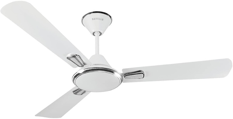 Elegant Designer Fan from Havells: Ceiling fans today need to have a colourful profile along with performance. The Havells Festiva ceiling fan is a designer fan that comes from Havells and features a finish that will grab the attention of everyone who looks at it. With the beautiful silver design on the rim of the motor and the uniquely designed blades of the fan, it can complement any home or office dcor theme. Along with its attractive looks, the Havells ceiling fan is also powerful in its function. Drawing a power of 70W, this fan offers a brisk and uniform cooling experience. Speedy and Instant Air Delivery: Ceiling fans tend to be noisy and often do not have the power or reach to cover large sized rooms. However, this Havells pearl white ceiling fan fulfills both these criteria with ease. With a powerful air delivery of 230cmm and a blade rotation speed of 350rpm, the fan sweeps at 1200mm, successfully circulating the air in even large sized rooms, keeping it well ventilated and breezy. Due to the double ball bearing system, it offers silent operation with no unwanted squeaky sounds. With a number of features along with its good looks, this ceiling fan is a useful buy. Brand: Havells . Power: 70W Speed: 350rpm Air Delivery: 230cmm Sweep: 1200mm Double ball bearing system Additional Features: Motor with decorative ring, decorative trims present on blades and canopy