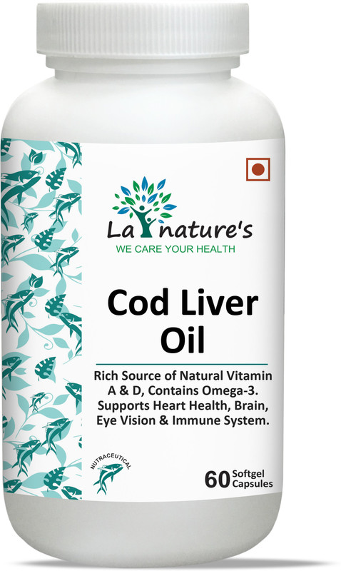 Cod liver La Natures Cod liver oil soft gel is rich in EPA & DHA which may help reduce inflammation and your risk of chronic diseases, such as heart disease. DHA supports brain function and eye health too. COD liver oil soft gel support relieve in joint stiffness related to arthritis. It has positive effect on cardiovascular health (heart nourishment) and helps repair damaged teeth, nail, hair and skin. It may support you build over all body immunity and ability to concentrate. There are fatty acid ( Omega-3) in Code liver which act as potent antioxidant La Natures Cod liver is GMO, gluten free and FSSAI approved product.
