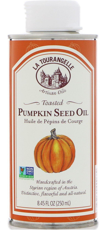 Artisan Oils Non-GMO Project Verified Handcrafted in the Styrian Region of Austria Distinctive, Flavorful and All-Natural Gluten-Free Sodium-Free Vegan BPA FreeLa Tourangelle brings your this Toasted Pumpkin Seed Oil from the Styrian region of Austria, home to the world’s best pumpkin seeds. Handcrafted following century-old Austrian traditions, each batch is toasted to perfection, expeller-pressed and lightly filtered. This oil adds a rich, toasted pumpkin seed taste to salad dressing, soup, marinade, pasta, dips, pastries and more.100% Pure pumpkin seed oil.May contains trace amounts of tree nuts, sesame seeds and peanuts.Warning Supplement Facts Serving Size: 1 Tbs. (15 ml) Servings Per Container: 17 Amount Per Serving %DV Calories 130 Fat Cal 130 Total Fat 14 g 22% Sat. Fat 3 g 15% Polyunsat. Fat 7 g Monounsat. Fat 4 g Trans Fat 0 g Cholest. 0 mg 0% Sodium 0 mg 0% Total Carb. 0 g 0% Protein 0 g Not a significant source of dietary fiber, sugars, vitamin A, vitamin C, calcium and iron. Percent Daily Values (DV) are based on a 2,000-calorie diet.