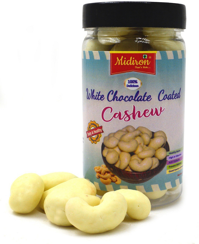 Midiron Handmade White Chocolate Coated Cashew in PET Jar. Dry fruits contain lots of healthy fats, fiber, protein, magnesium and rich in vitamins. The health benefits of almonds include lower blood sugar levels, reduced blood pressure and lower cholesterol levels. They can also reduce hunger and promote weight loss. This is a perfect combo of healthy and testy. Best in Quality and packed in airtight Jar you can carry easily anywhere and this jar easily fit your bag. This Jar is Seal packed to retain freshness and also increase shelf life of dry fruit. Midiron more flavored of dry fruit Like Chocolate coated almond, white chocolate coated cashew, Paan Flavored Raisin, Mango Flavored Raisin, Chocolate Coated Raisin.