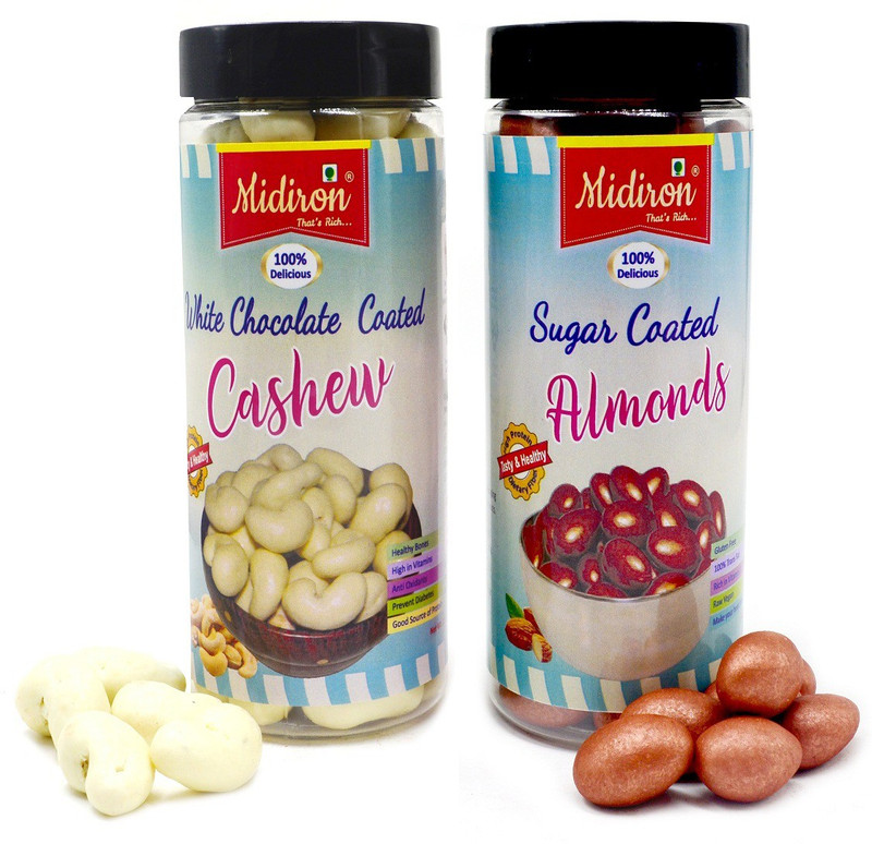 Midiron Handmade Chocolate Brass Almond with White Chocolate Coated Cashew in PET Jar. Dry fruits contain lots of healthy fats, fiber, protein, magnesium and rich in vitamins. The health benefits of almonds include lower blood sugar levels, reduced blood pressure and lower cholesterol levels. The fat in cashews is good fat, which is believed to help prevent heart disease and reduce the risk of stroke. The fat also helps you feel full and satisfied and may help in managing your weight. 100% Natural & Best in Quality and packed in airtight Jar you can carry easily anywhere and this jar easily fit your bag. This Jar is Seal packed to retain freshness and also increase shelf life of dry fruit.
