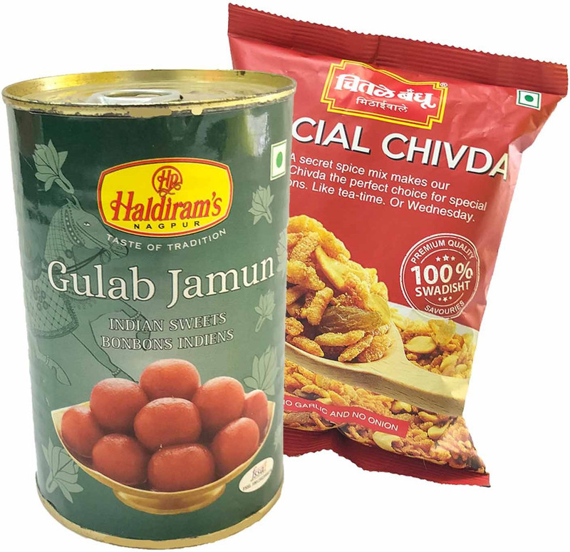 Haldirams Gulab jamun tin 500gms, Chitale Special Chiwda 200gms, 1 Mithai4all Branded Paper Bag