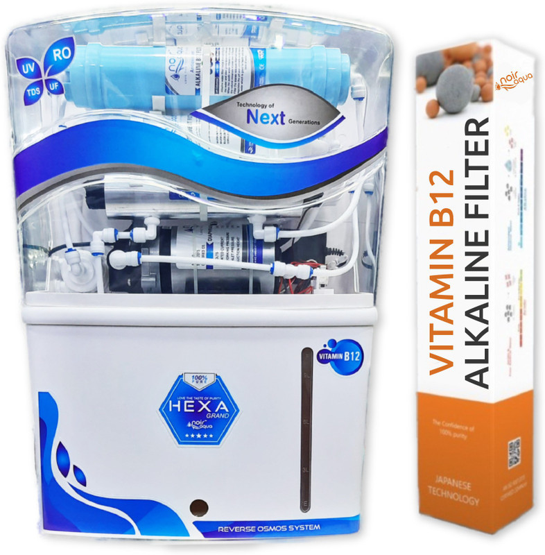 Noir Aqua, the most trusted and preferred brand in water purification.This water purifier has a capacity of 12 Ltr ,so as to ensure continuous supply of purified water even when there is no electricity or running tap water. With a fully automatic operation, this purifier begins the purification process when the water level falls below maximum. It automatically stops when the tank is full or when there is no inlet supply of water.The multistage purification system gets rid of impurities like arsenic, fluorides, rust, and bacteria, keeping your water free of germs and contaminants. Moreover, the UV light inside the storage tank keeps your water clean and safe to drink for long hours.Ultra Smart Low Maintenance Water Purifier, In which there Is RO + UV + UF + TDS Controller with An advance alkaline, B12 Technology though which you can get 100% pure and healthy water.