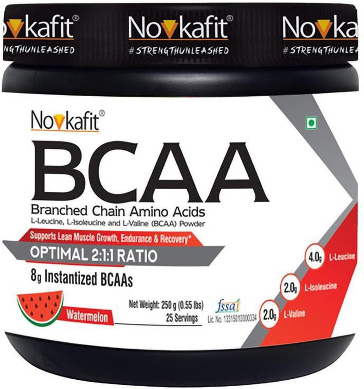 Novkafit BCAA (Branched Chain Amino Acids) is a great tasting sports nutrition supplement that has been formulated to provide a premium and high quality essential amino acid supplementation to fitness enthusiasts. Our BCAA is instantized which helps it mix easily and stay suspended longer. BCAAs account for about one-third of all muscle proteins and are essential since they cannot be produced by the body and must be obtained from the diet. The 3 BCAAs; Leucine, Isoleucine and Valine are present in the optimal 2:1:1 ratio to help support your fitness needs. BCAAs have been scientifically shown to support muscle growth and fatigue-reduction during intense workouts.